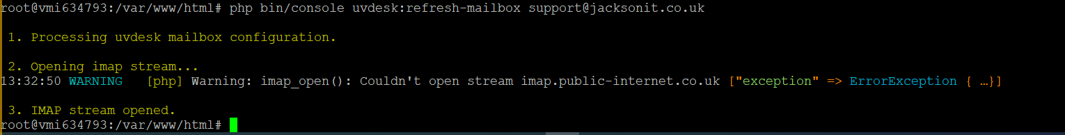 OMG! @vipin you are an absolute genius! Editing the uvdesk_mailbox.yaml and adding the '{imap.public-internet.co.uk:993/imap/ssl}INBOX' string worked!